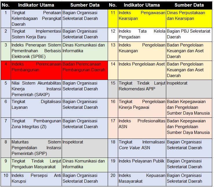 Reformasi Birokrasi pada level PD memiliki 20 Indikator, sebagaimana berikut: